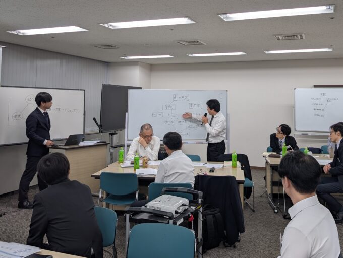 経営診断の全体像のうち、原因分析、改善提案、診断ストーリーに関する演習を実施しました。「知っている」から「できる」へと近づくために、何ができていて、何ができていないのか、どうしたらできるようになるのかの気づきを得ることが目的です。原因分析のワークは、事例をもとにまず個人で考え、その後グループで共有してディスカッションする流れです。ホワイトボードを使って、思考プロセスをロジック・ツリーで可視化して発表しました。